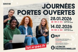 - Journées Portes Ouvertes de l'IUT de Créteil-Vitry le mercredi 28 janvier et le samedi 14 février 2026Rendez-vous le mercredi 28 janvier et le samedi 14 février 2026 pour nos Journées Portes Ouvertes ! Nos 8 départements vous accueilleront pour des visites et des présentations de nos formations.Les deux sites seront ouverts à ces deux dates ; veillez toutefois à vous rendre sur le site qui propose la formation qui vous intéresse.