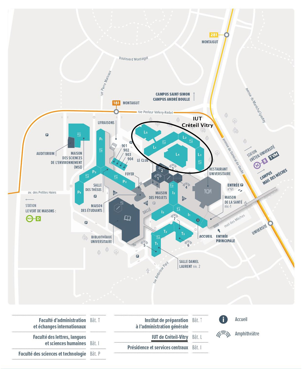 4 départements de formation ainsi que la Direction et les services centraux de l'IUT de Créteil - Vitry sont implantés à Créteil, sur le site central de l'Université Paris-Est créteil.